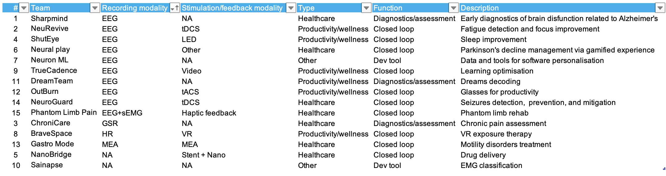 - Healthcare neurotech (7 out of 15 projects) tackled diagnostics, rehabilitation, and mental health;